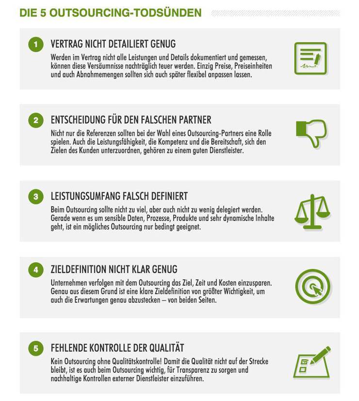 Outsourcing soll Ihre Mitarbeiter entlasten, führt aber häufig zu Misstrauen: Die Belegschaft fürchtet, dass mit diesen Maßnahmen ein Personalabbau verbunden ist. Dadurch entsteht die Gefahr: Der externe Dienstleister wird als Konkurrent empfunden – und nicht als Partner, um das Unternehmen voranzubringen. Darunter leidet dann die Zusammenarbeit, große Verluste an Effizienz sind die Folge. Dieses Problem lässt sich nur durch eine transparente Kommunikation lösen, die alle Sorgen Ihrer Mitarbeiter ernst nimmt.